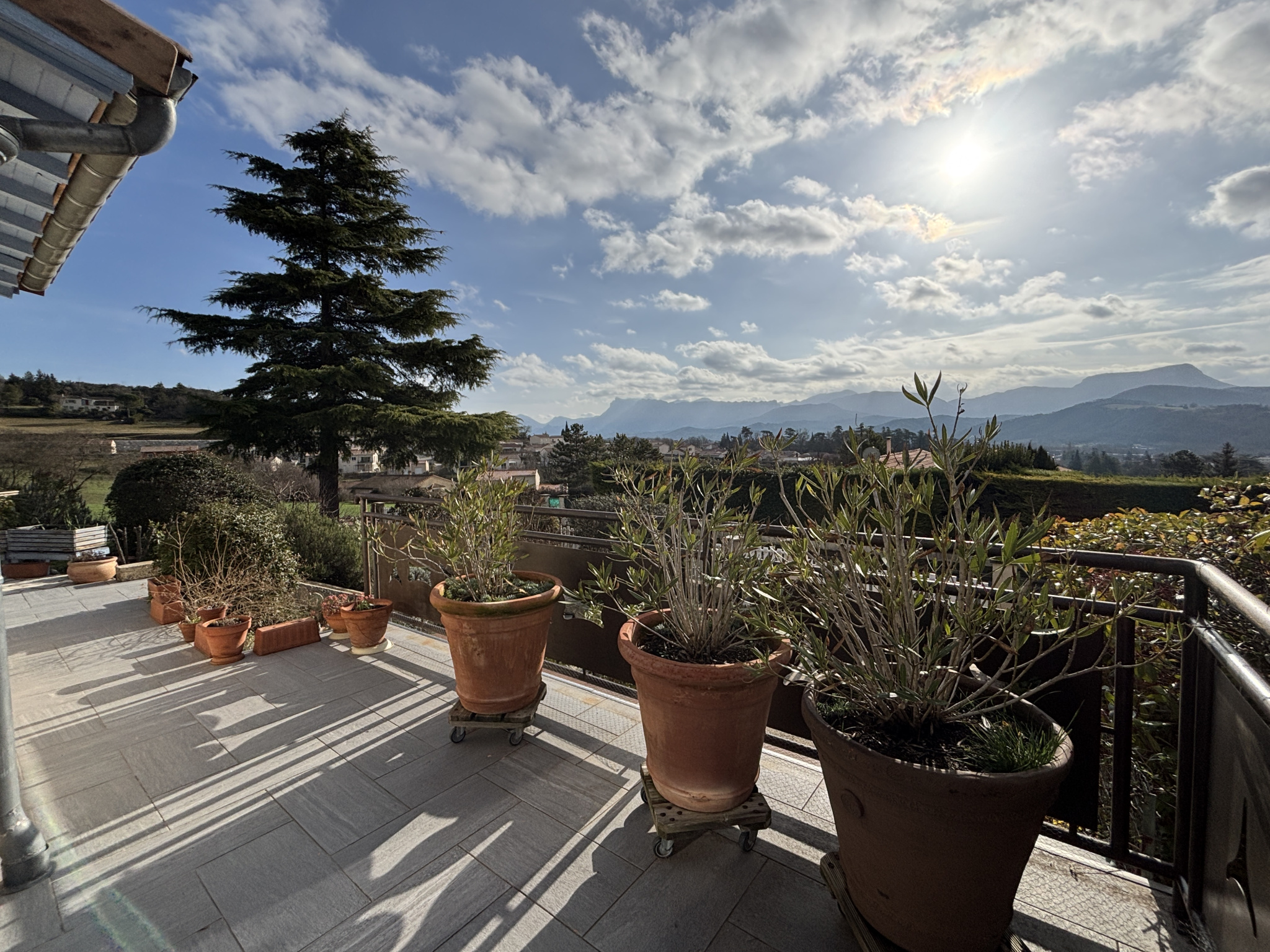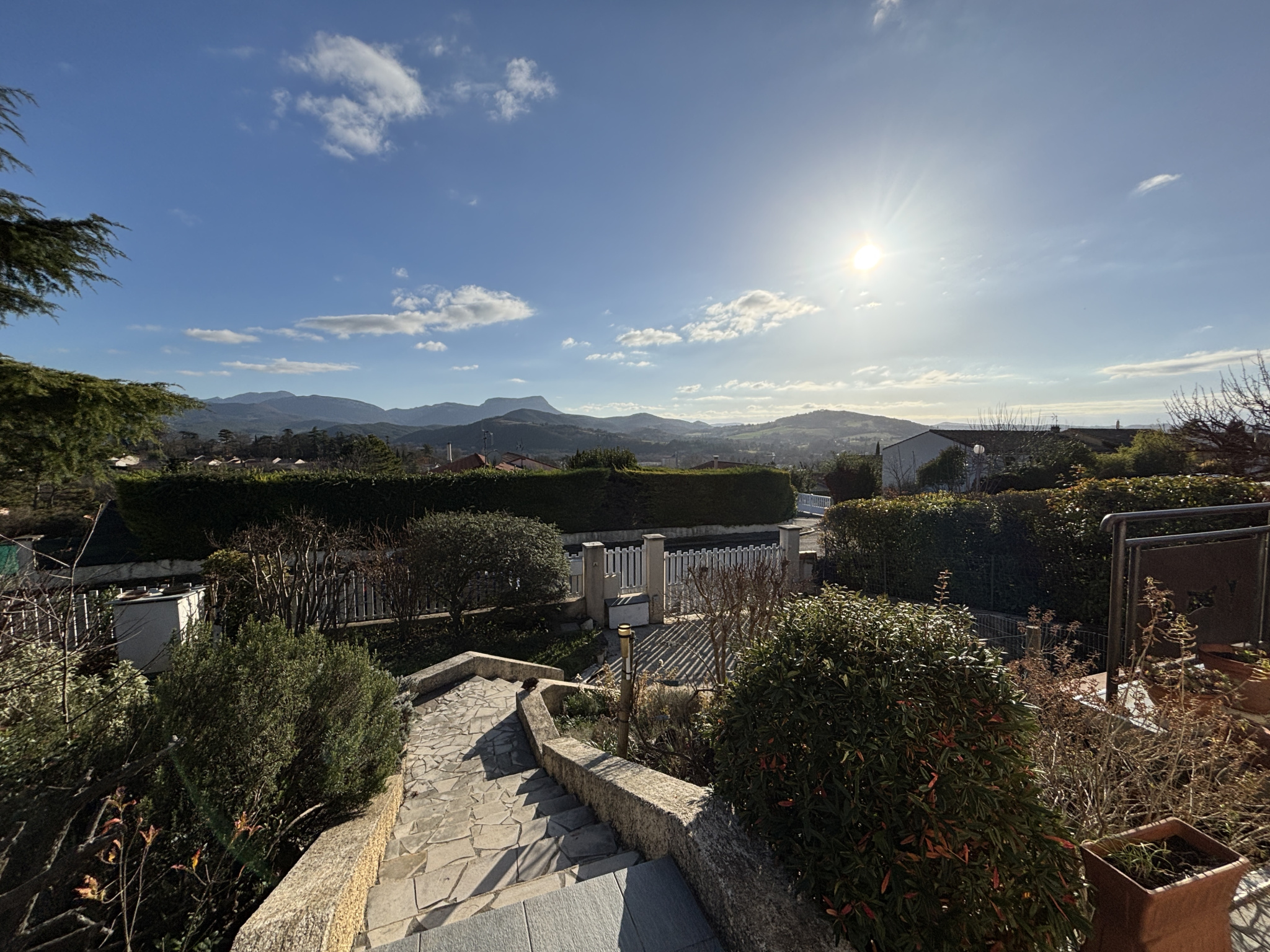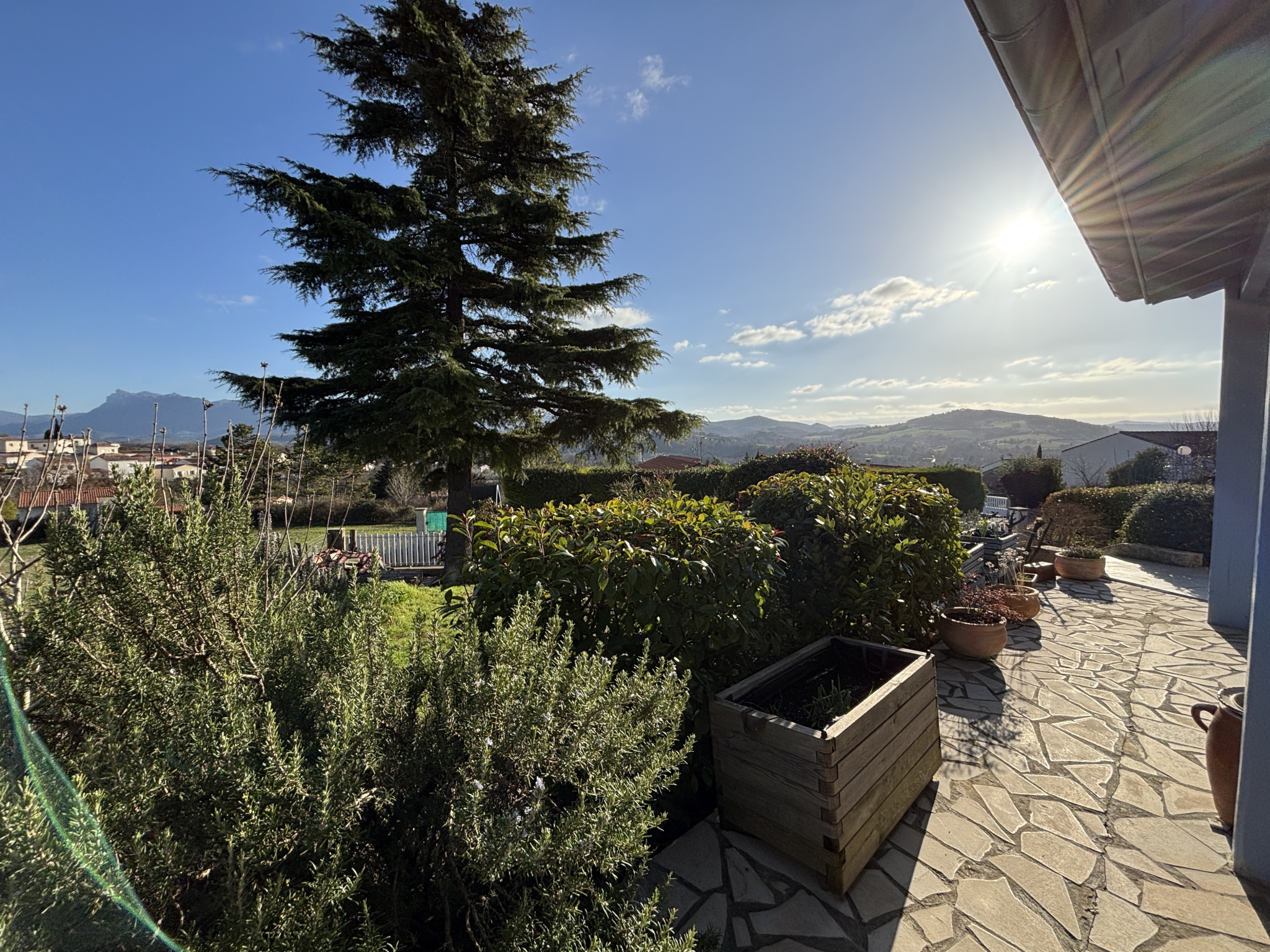 L’ensemble des pièces de la maison communique avec cette belle terrasse en triple exposition laissant place à la fois à un ensoleillement tout au long de la journée et une vue incroyable sur la plaine et les montagnes. Elle surplombe un beau jardin arboré et clôturé avec citerne de récupération des eaux de pluie.