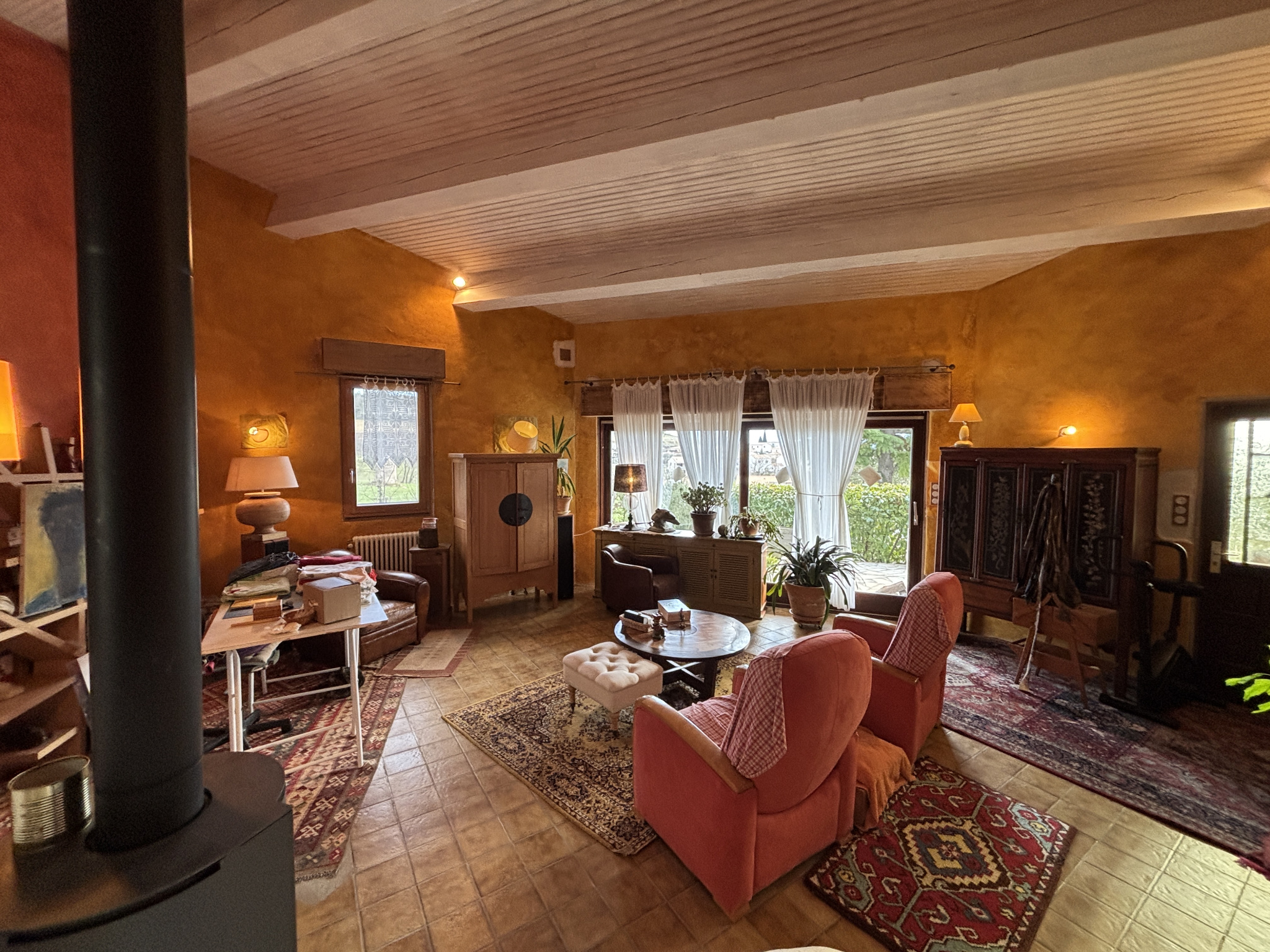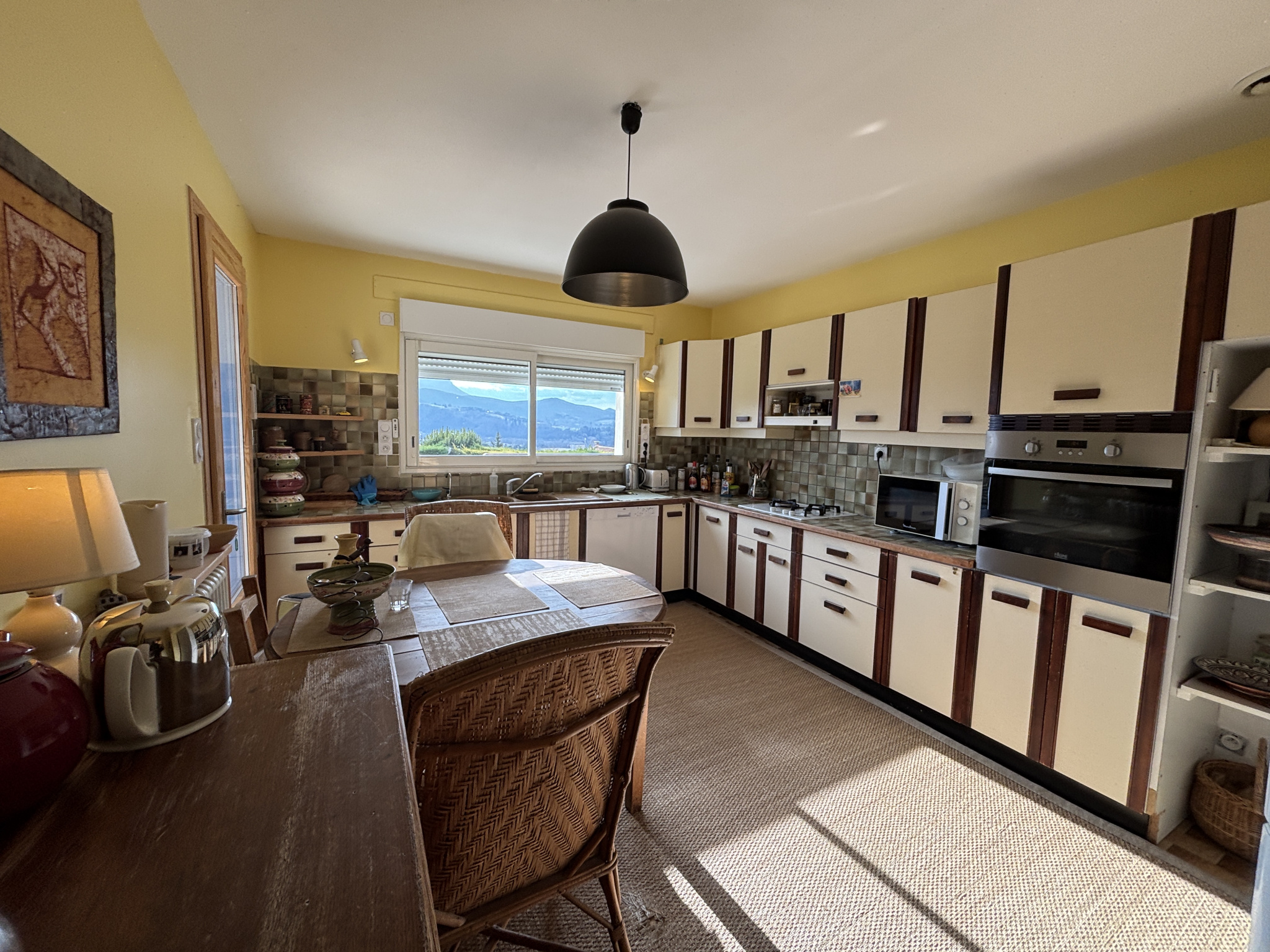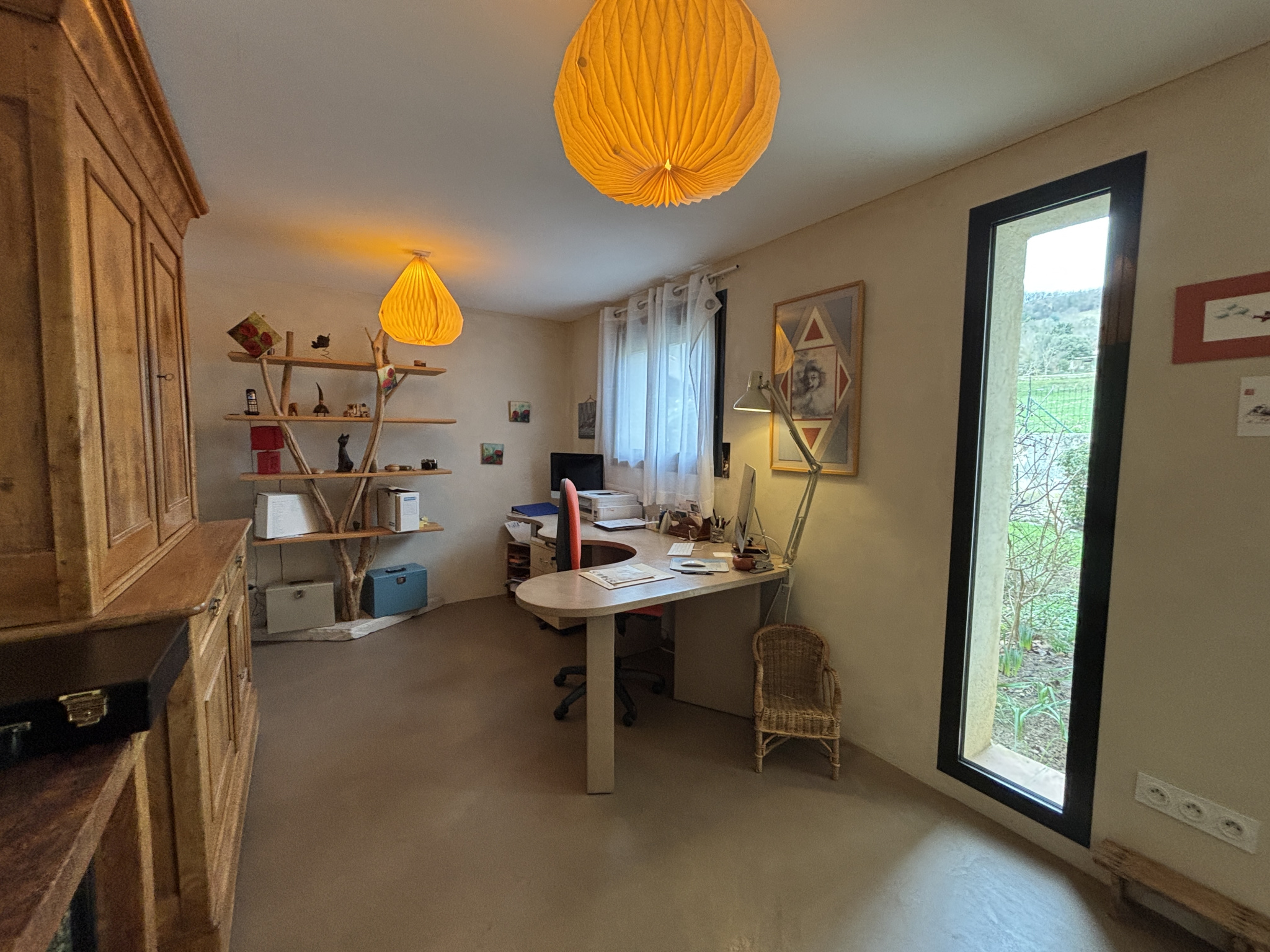 L’ensemble des pièces de la maison communique avec cette belle terrasse en triple exposition laissant place à la fois à un ensoleillement tout au long de la journée et une vue incroyable sur la plaine et les montagnes. Elle surplombe un beau jardin arboré et clôturé avec citerne de récupération des eaux de pluie.